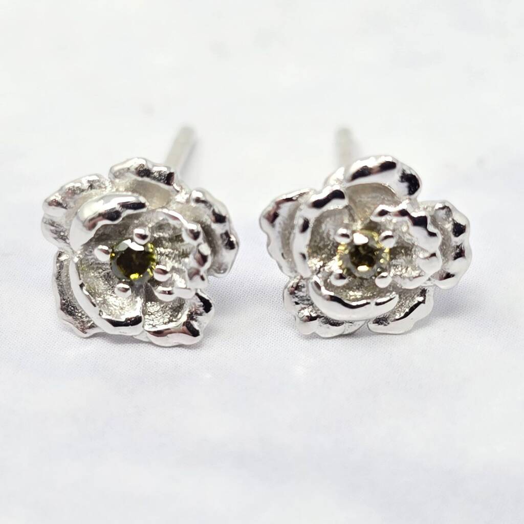 Sterling silver poppy stud earrings with August’s peridot, perfect for birthdays, meaningful gifting, or adding elegance, charm, and vibrant colour to outfits.Poppies symbolise remembrance and beauty, making these birthstone studs a meaningful accessory. The peridot adds a fresh, lively colour accent. Delivered in luxury gift packaging, ready for gifting.