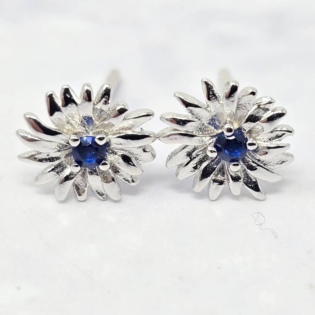 Sterling silver aster stud earrings with September’s sapphire, perfect for birthdays, meaningful gifting, or adding subtle elegance and deep colour to everyday wear.Asters symbolise wisdom and faith, making these studs a meaningful accessory. The sapphire adds a rich, elegant touch. Arrives in luxury gift packaging, ready for gifting.