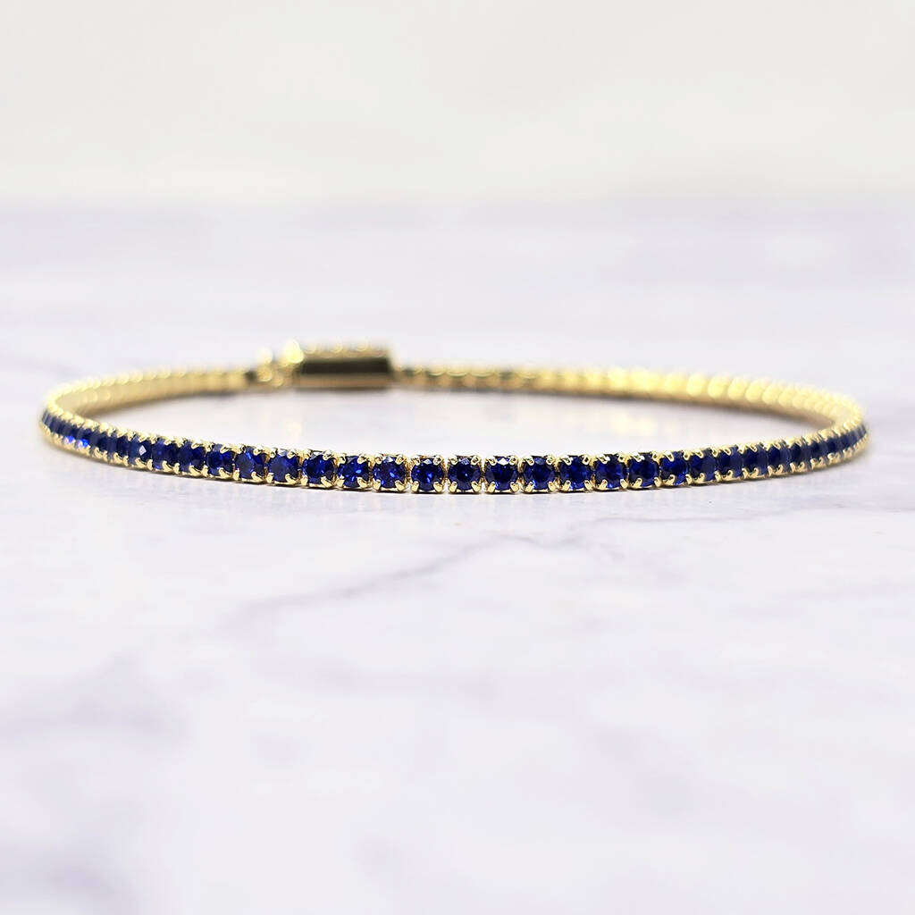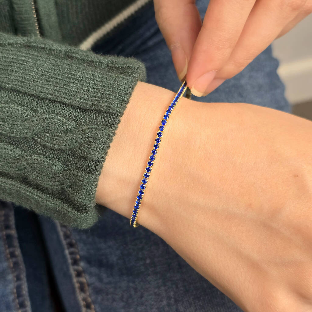 The bracelet is plated in 18ct gold over sterling silver with a protective e-coating and features 2mm Sapphire cubic zirconia stones. To maintain its shine, avoid contact with water, perfumes, and harsh chemicals, and store it safely in the provided luxury packaging when not being worn.