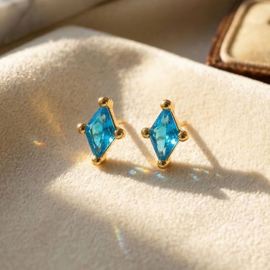 Our Tiny Turquoise Stud December Birthstone Diamond Shaped Earrings showcase stunning turquoise gemstones, celebrated for their vibrant blue hue and rich cultural significance.These diamond-shaped studs are crafted from high-quality materials, making them perfect for both casual and formal occasions while adding a refreshing pop of colour to any ensemble. As December's birthstone, turquoise represents protection, wisdom, and tranquility, making these earrings a thoughtful gift for birthdays, holidays, or special celebrations. With their unique design and meaningful symbolism, these earrings are a delightful addition to any jewellery collection, embodying both style and significance.