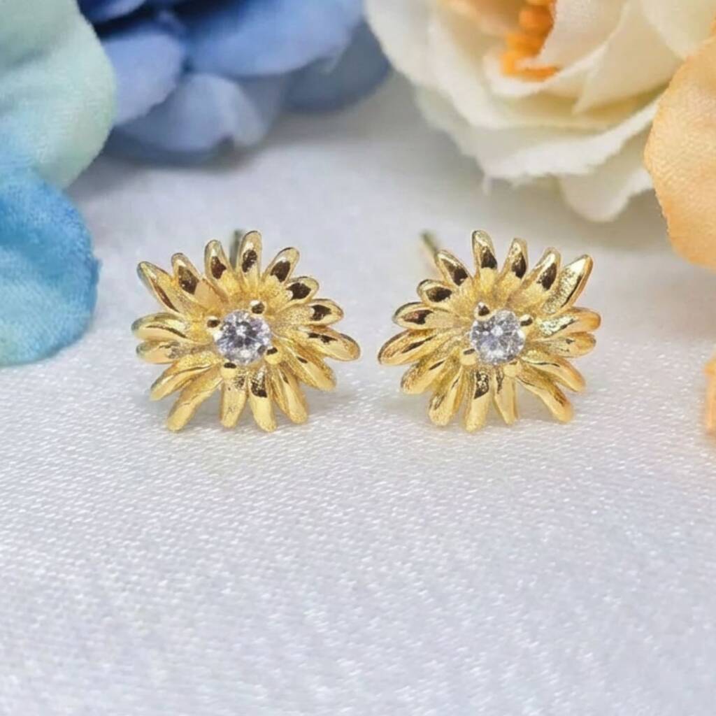 Gold plated daisy stud earrings featuring April’s white topaz birthstone, perfect for birthdays, thoughtful gifting, and adding timeless elegance and sparkle to everyday outfits.Daisies symbolise purity and innocence, making these earrings a heartfelt keepsake gift. The white topaz adds radiant sparkle and refined sophistication. Arrives in luxury gift packaging, ready to gift.