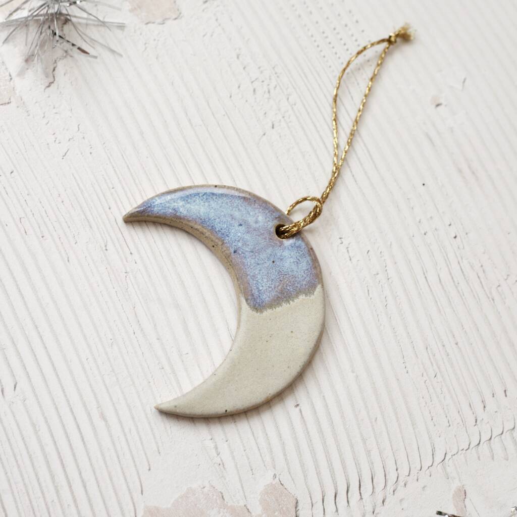 Handmade Ceramic Moon Ornament: Blue And White Glaze, Festive Tree Decoration