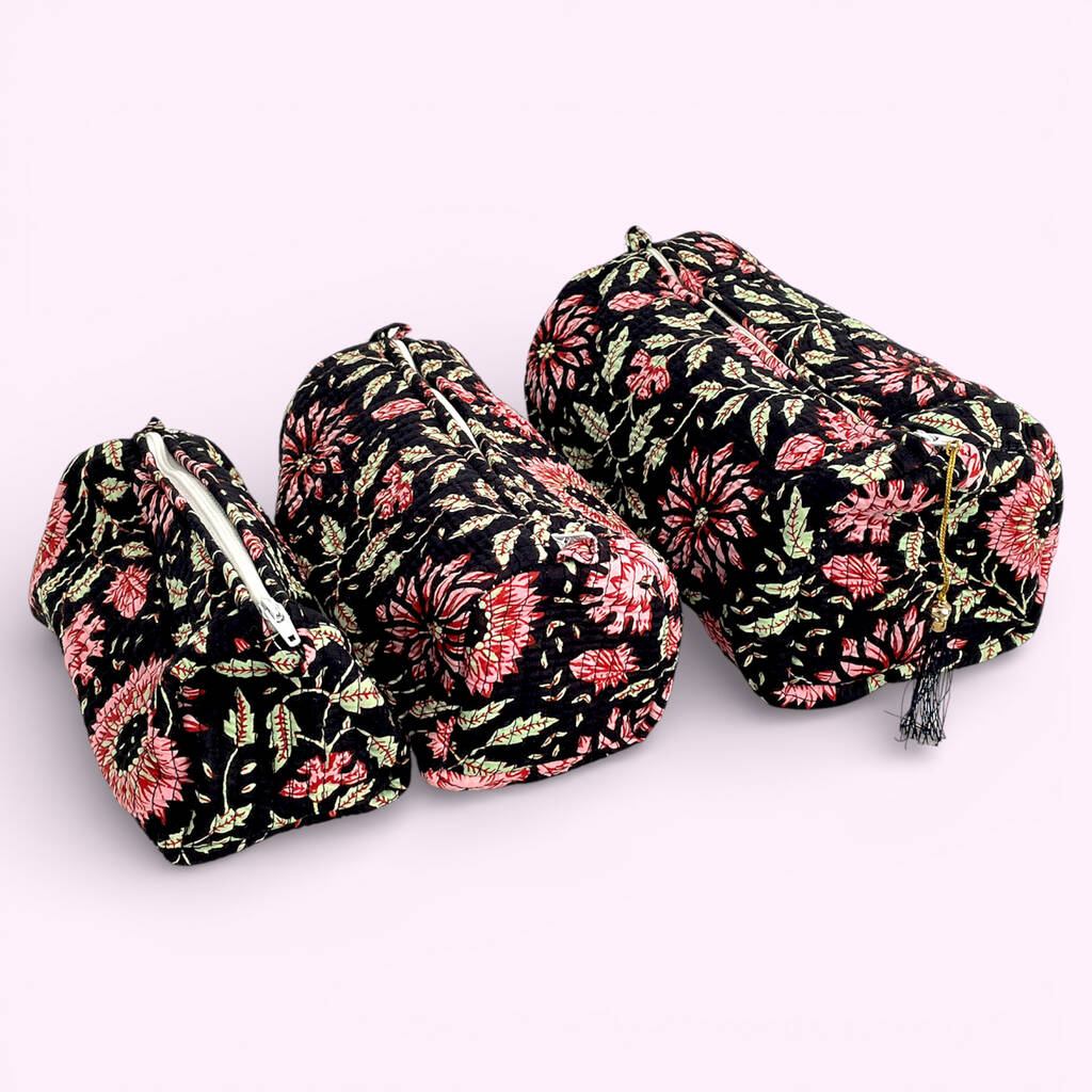 Black And Pink Floral Block Print Cotton Washbag, Make Up Bag