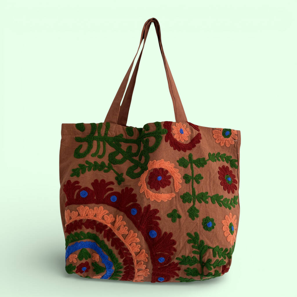 Embroidered Cotton Shoulder Bag In Brown