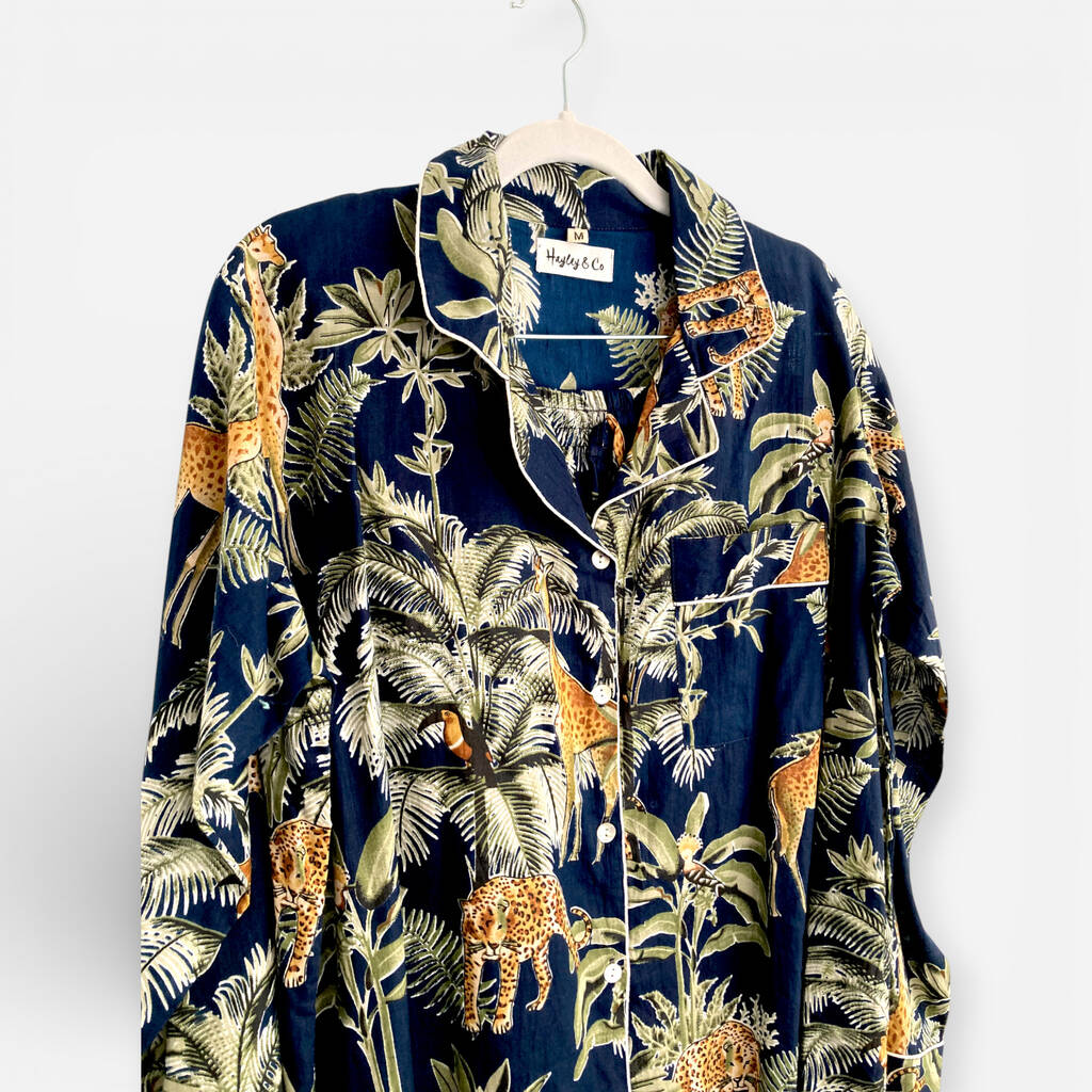 Giraffe And Leopard Print 100% Cotton Ladies Pyjamas In Dark Blue
