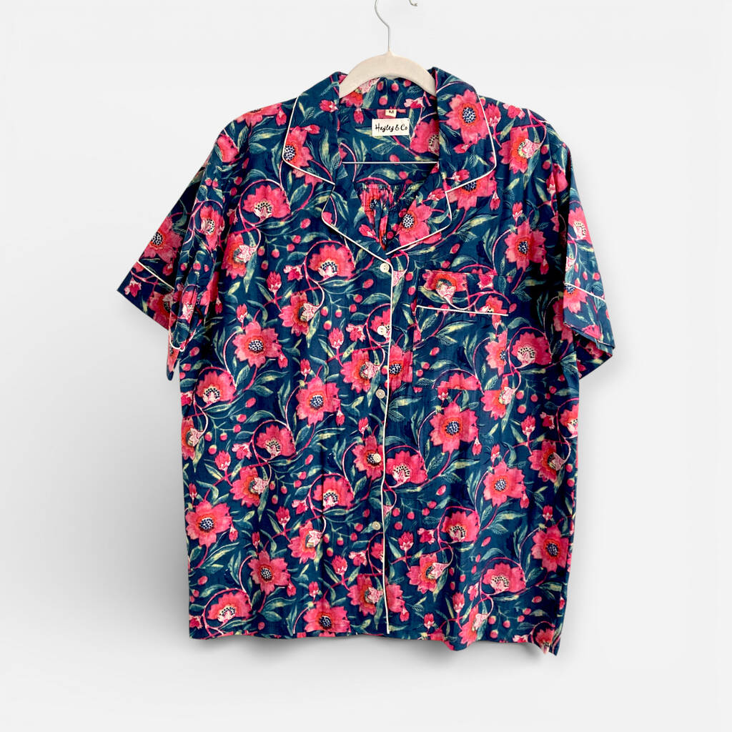 Navy And Pink Block Print 100% Cotton Ladies Pyjama Short Set