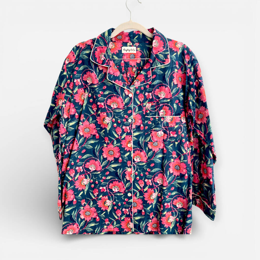 Navy And Pink Block Print Floral 100% Cotton Ladies Pyjamas