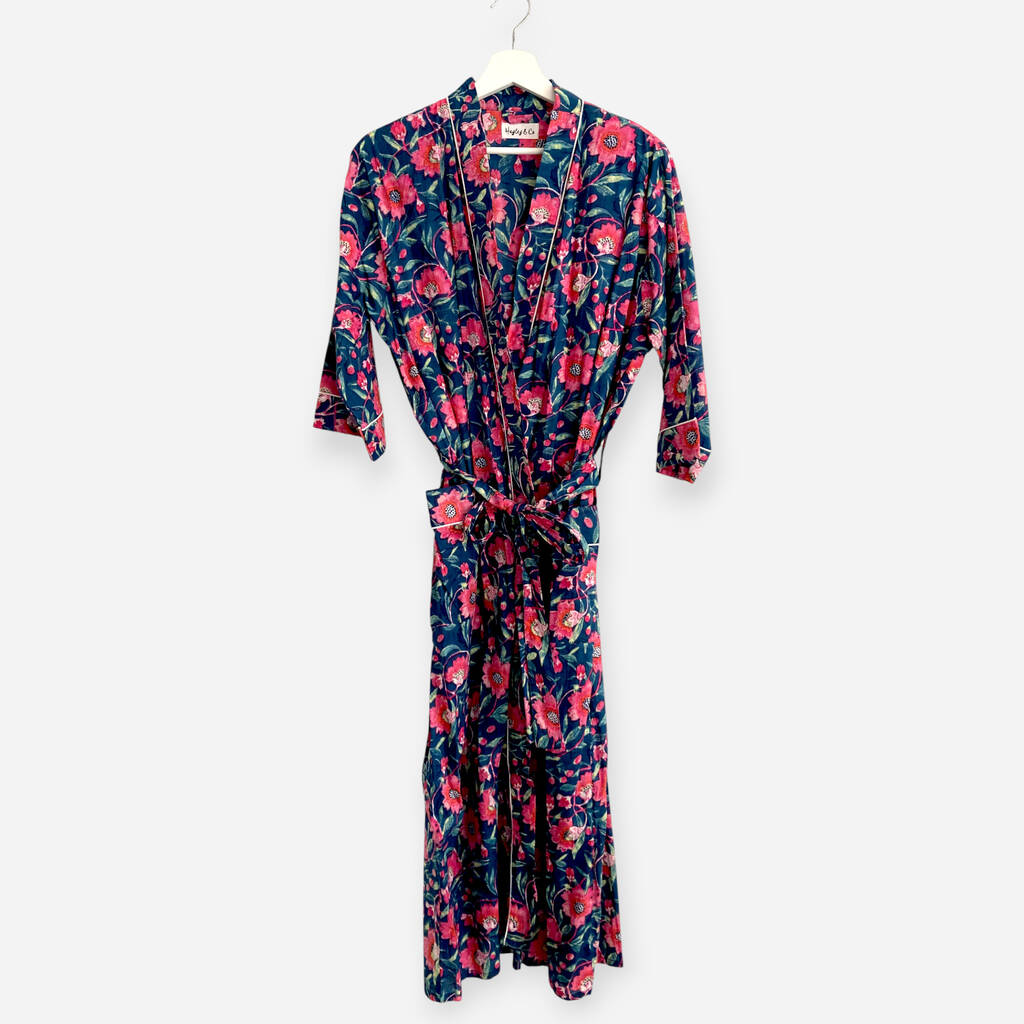 Navy And Pink Flower Block Print 100% Cotton Dressing Gown Kimono
