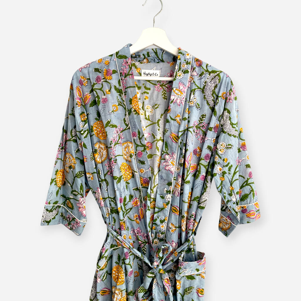 Pale Blue Flower Block Print 100% Cotton Dressing Gown Kimono
