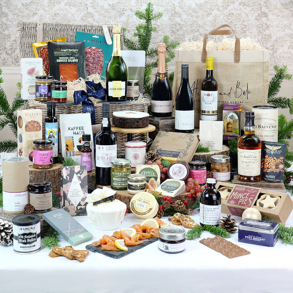 Introducing The Longhoughton Luxury Christmas Feast, a grand and generous Christmas Gift Hamper, designed for true gourmets and connoisseurs of fine food and drink. Presented in a traditional wicker basket with an antique wash finish alongside a luxurious Heather and Bale shopping bag. This festive collection offers an impressive array of carefully curated, small-batch artisan products.