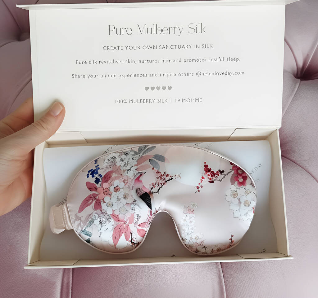 Get your beauty sleep with this delicate pink blossom luxury silk eye mask. Fully adjustable, Presented in a gift box, ready to gift
