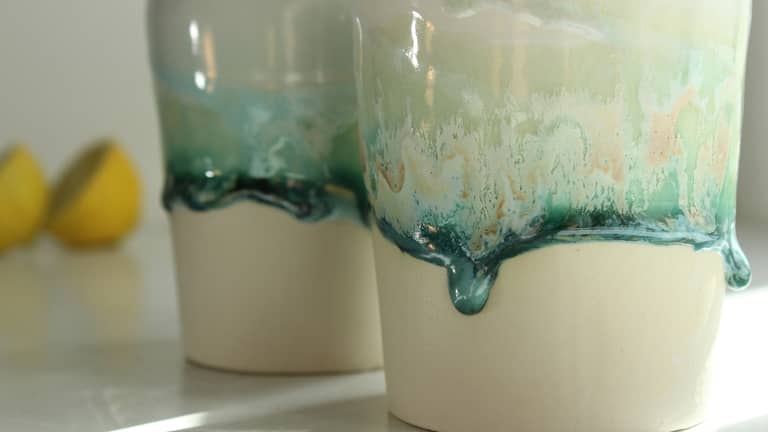 Molten and cooled glazes form the surfaces of Helen’s pieces. Glaze fused, chemistry compositions cascade and reassemble as aquascapes and horizons, places where scale and form are less perceptible. This gives way to an exploratory feel, both sensory and mental. Current works explore what a vase form is using slip casting, slab ware hand building techniques and ever evolving glazed surfaces.