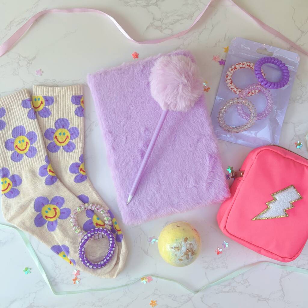 A fun gift for tweens & teens with a fluffy notebook, pen, bag, socks, bath bomb & hair ties. Perfect for birthdays or feel-good gifting.