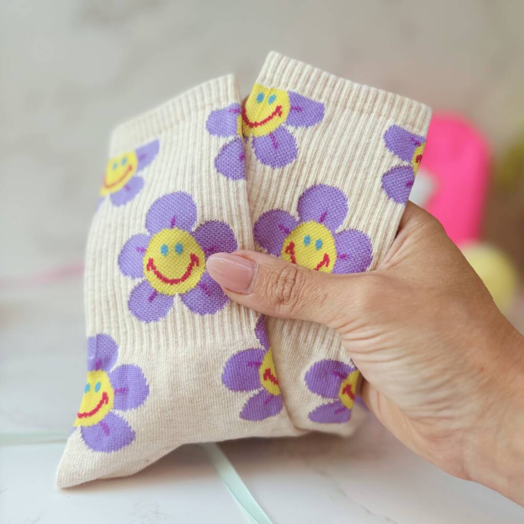 ▪️ Cream socks with purple smiley face flowers – cosy and fun. Fits UK sizes 3-8.