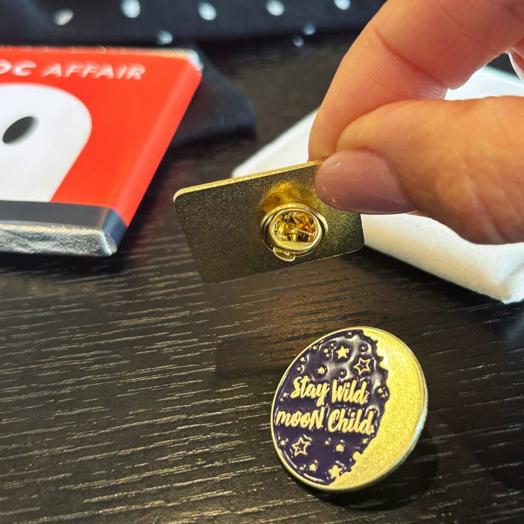 ▪️ Two Celestial Pin Badges – midnight blue designs with pin & clasp backs: 'Phases of the Moon' & 'Stay Wild Moon Child' Both presented in a soft velvet-style pouch