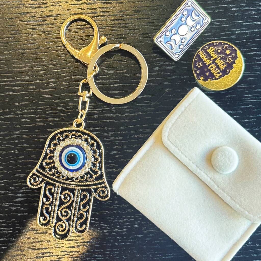 ▪️ All-Seeing Eye keyring – intricately detailed with clasp in midnight blue.