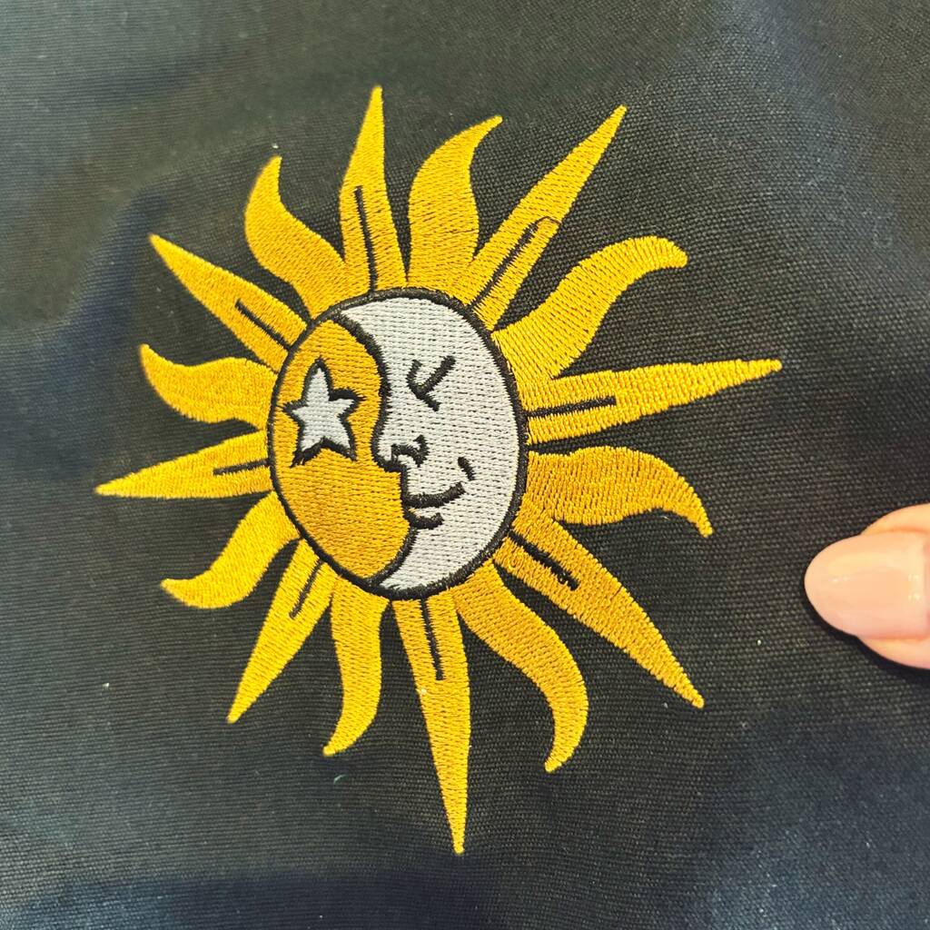 ▪️ Black tote bag – beautifully embroidered with a gold sun & silver moon, durable for everyday use. Ideal for shopping trips.