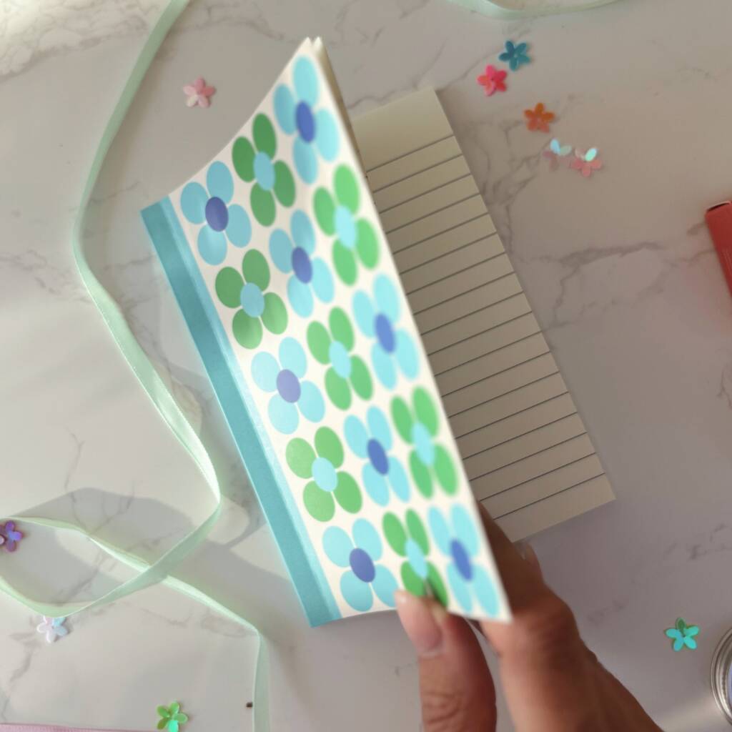▪️Patterned lined notebook with retro-style floral print in pinks and greens. Please note - the notebook currently has blue and green flowers (see photos).