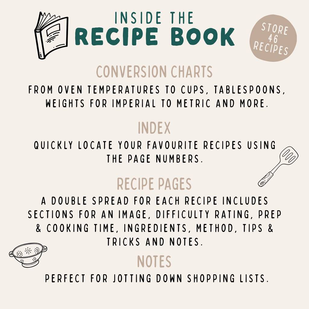 Embark on a flavorful journey with our Recipe Book! It's your kitchen sidekick packed with handy features like an easy-to-use index, conversion charts to make cooking a breeze, and spacious pages for each recipe. Perfect for bakers and chefs. no matter if you're cooking up family favourites or experimenting with new dishes, this book has an easy format to enter and follow recipes.