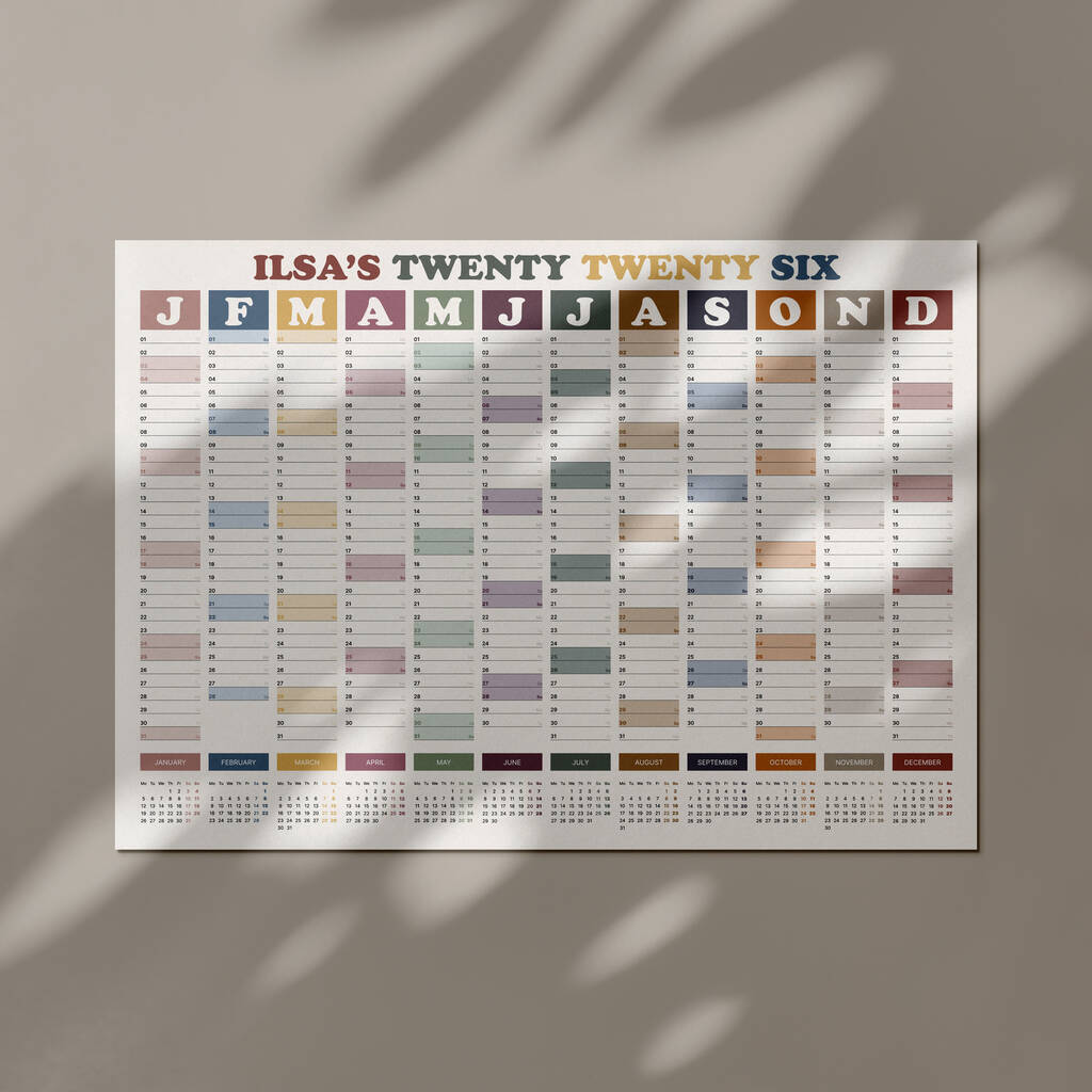 Bring colour and character to your year with our 2026 wall organiser. Featuring bold, vintage-inspired monthly blocks and a horizontal year-at-a-glance layout, it’s as decorative as it is practical. Shaded weekends and a complete mini calendar strip at the bottom make planning easy, whether you’re managing family routines, school events or office deadlines.