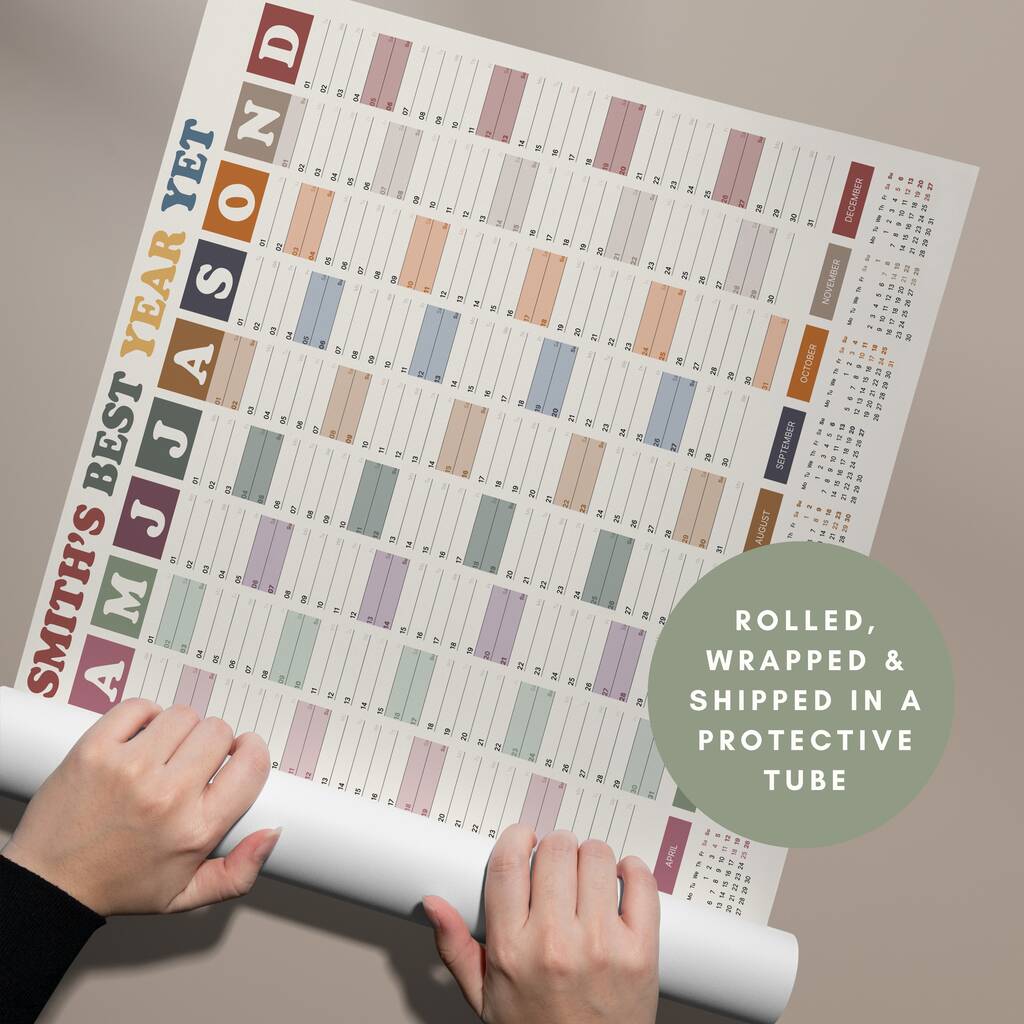 A bold retro wall planner with colourful blocks and monthly calendar strip. Can be personalised with your text — great for homes, classrooms or offices