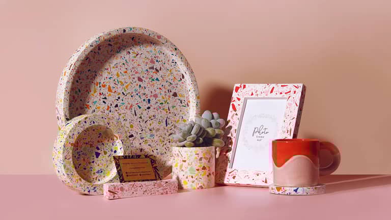 Louder, bolder, more vibrant than ever, our handmade terrazzo home accessories embrace colour, pattern and shape to give your homes a colourful, exciting playfulness.