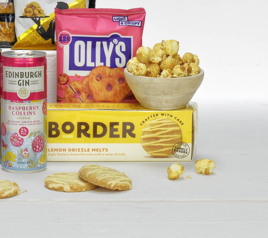 Discover our Cocktail Hamper, a delightful mix of Edinburgh Gin Raspberry Collins, gourmet snacks, sweet treats, and savoury nibbles—crafted for stylish celebrations and unforgettable moments.Elevate your celebrations with our luxurious Cocktail Hamper, thoughtfully curated for those who love to indulge in style. This beautifully presented gift set includes refreshing Edinburgh Gin Raspberry Collins cans, perfectly paired with a tempting selection of sweet and savoury delights. Enjoy Joe & Seph’s gourmet sweet and salty popcorn, Border’s buttery lemon drizzle biscuits, crunchy salted cashews, Olly’s light and crispy pretzels, and Holmes Bakery’s golden flapjacks. Whether it’s a birthday, thank you gift, or a treat for yourself, this hamper is designed to impress and delight. A perfect choice for cocktail lovers and food enthusiasts alike.