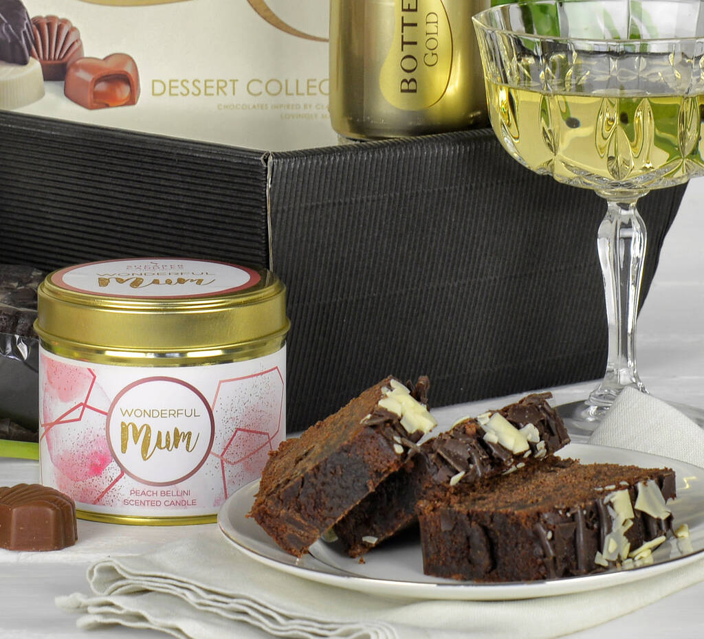 Show your love and appreciation with this hamper for Mum, featuring chocolates, chocolate cake, prosecco, and a “Wonderful Mum” candle to make her day.