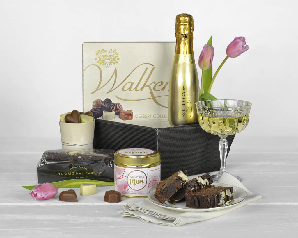 This beautifully curated hamper is the perfect way to spoil Mum. A mini bottle of Bottega Gold Prosecco adds sparkle to the occasion, paired with Walker’s Dessert Collection chocolates offering an indulgent mix of flavours. The rich chocolate cake from The Original Cake Company provides a deliciously decadent treat, perfect alongside her favourite drink. To create a warm, thoughtful touch, the “Wonderful Mum” scented candle fills the room with a delicate fragrance, making it both personal and special. Presented with charming details like fresh tulips, this hamper is a delightful gift for Mother’s Day, birthdays, or simply to say thank you.