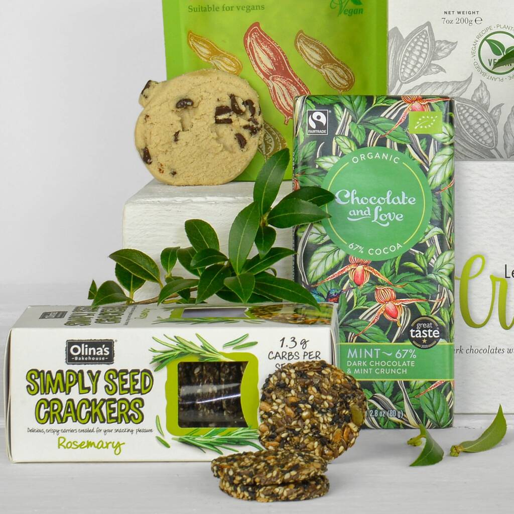 Treat someone special with this delightful vegan gift box, filled with indulgent chocolate, savoury nibbles, and comforting tea — a thoughtful hamper for every occasion.
