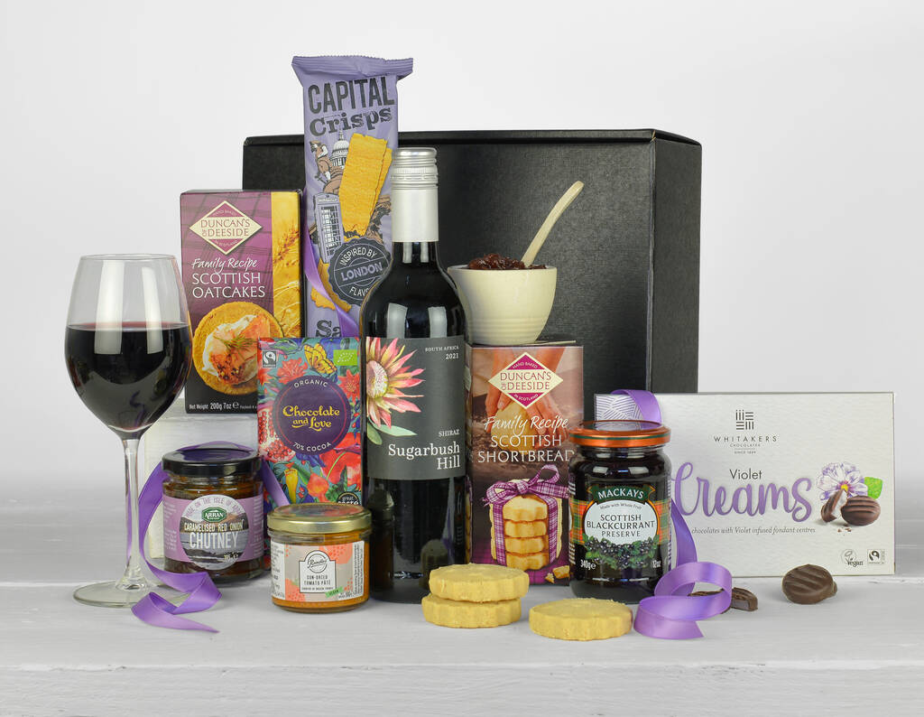 This indulgent vegan hamper combines the very best sweet and savoury treats. A bottle of Sugarbush Hill Shiraz provides rich, fruity notes, perfect for pairing with the included nibbles. Sweet touches include Whitaker’s Violet Creams, Chocolate & Love Organic Dark Chocolate, and Duncan’s of Deeside’s Scottish Shortbread. For a savoury balance, traditional Scottish Oatcakes and Capital Crisps offer delicious crunch. Enhancing the experience further are jars of caramelised red onion chutney, tomato chutney, and Mackays Scottish Blackcurrant Preserve, bringing depth and flavour to the spread. Beautifully presented, this hamper makes a memorable plant-based gift for birthdays, anniversaries, or simply as a thoughtful treat.