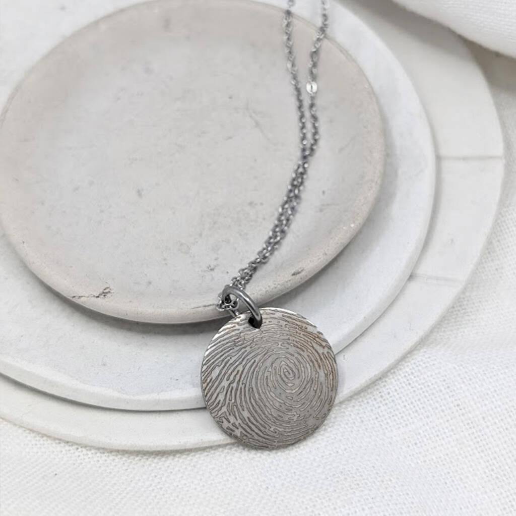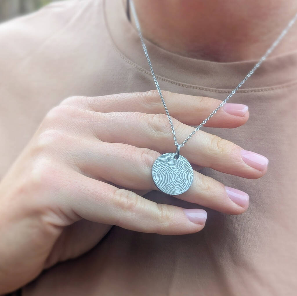 Personalised Fingerprint Disc Stainless Steel necklace which can feature engraved handwriting or text on the reverse!