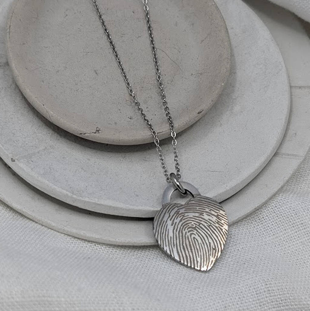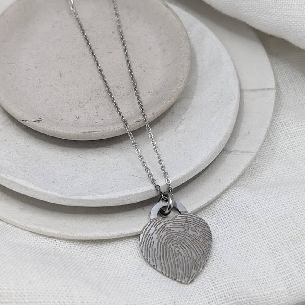 Featuring your unique loved ones fingerprint and even their handwriting. The perfect everyday necklace for active lives with all the poignancy of our precious metal pieces but with the extra strength and durability of Stainless Steel to wear anywhere anytime.