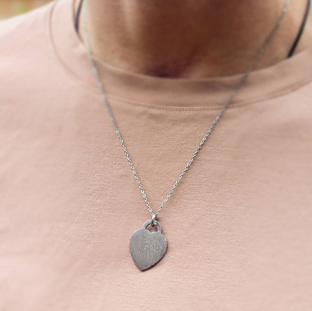 Personalised Fingerprint Padlock Heart Stainless Steel necklace which can feature engraved handwriting or text on the reverse!
