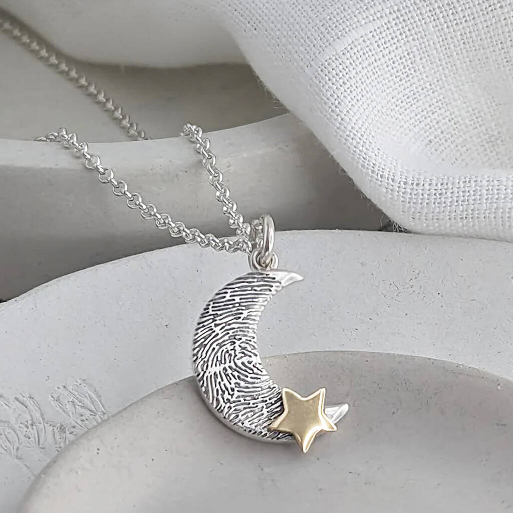 Our gorgeous Loved to the Moon and Stars Fingerprint Necklace captures your loved one's unique fingerprint in precious silver and gold to cherish forever.
