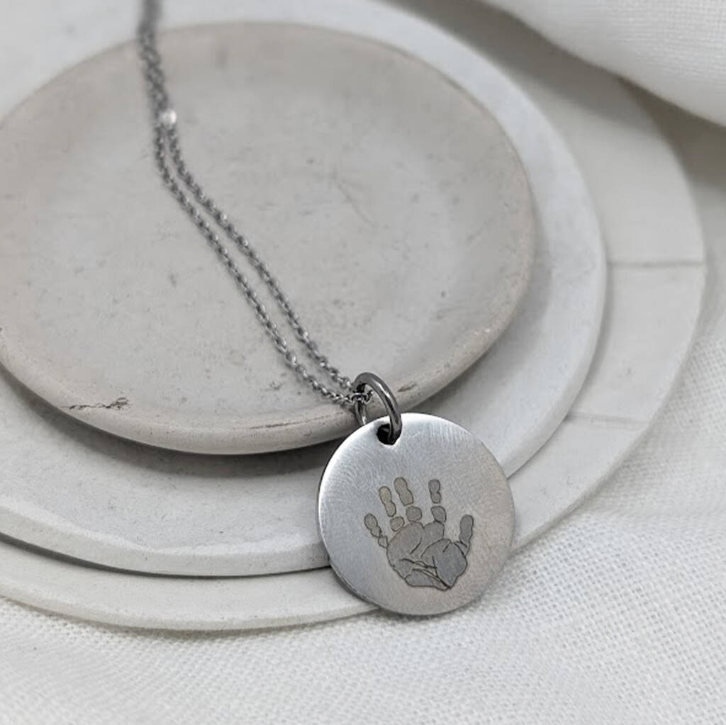 Personalised Handprint Stainless Steel Disc Necklace which can feature engraved handwriting or text on the reverse!