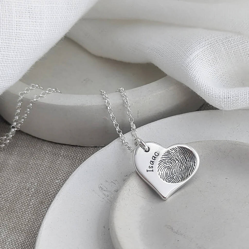 A beautiful fingerprint heart pendant, capturing your loved one's own unique fingerprint in exquisite detail.