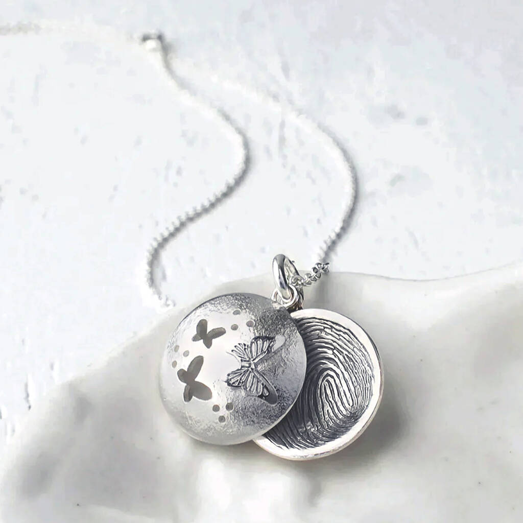 This beautiful butterfly fingerprint locket necklace is the perfect way for her to wear a cherished fingerprint from a loved one.