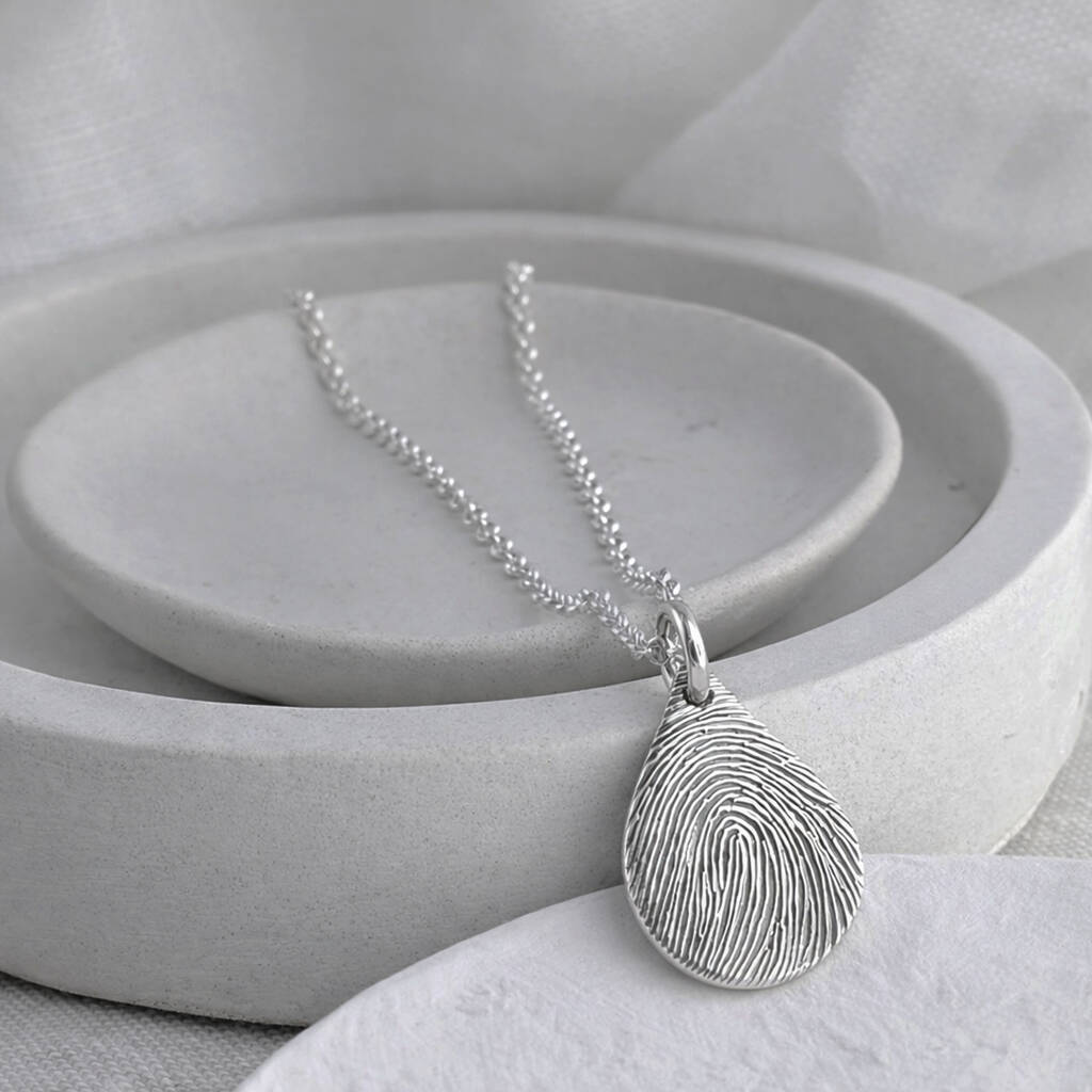 This elegant silver dewdrop fingerprint necklace is the perfect way to cherish a loved one's fingerprint.