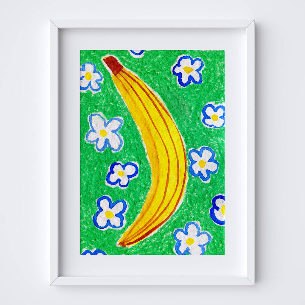 A playful banana on a daisy-patterned tablecloth art print, created using watercolours and pastels, combines vibrant tones with charming detail. This cheerful piece brings a whimsical touch to kitchens, dining spaces, or anywhere needing a pop of fruity fun.