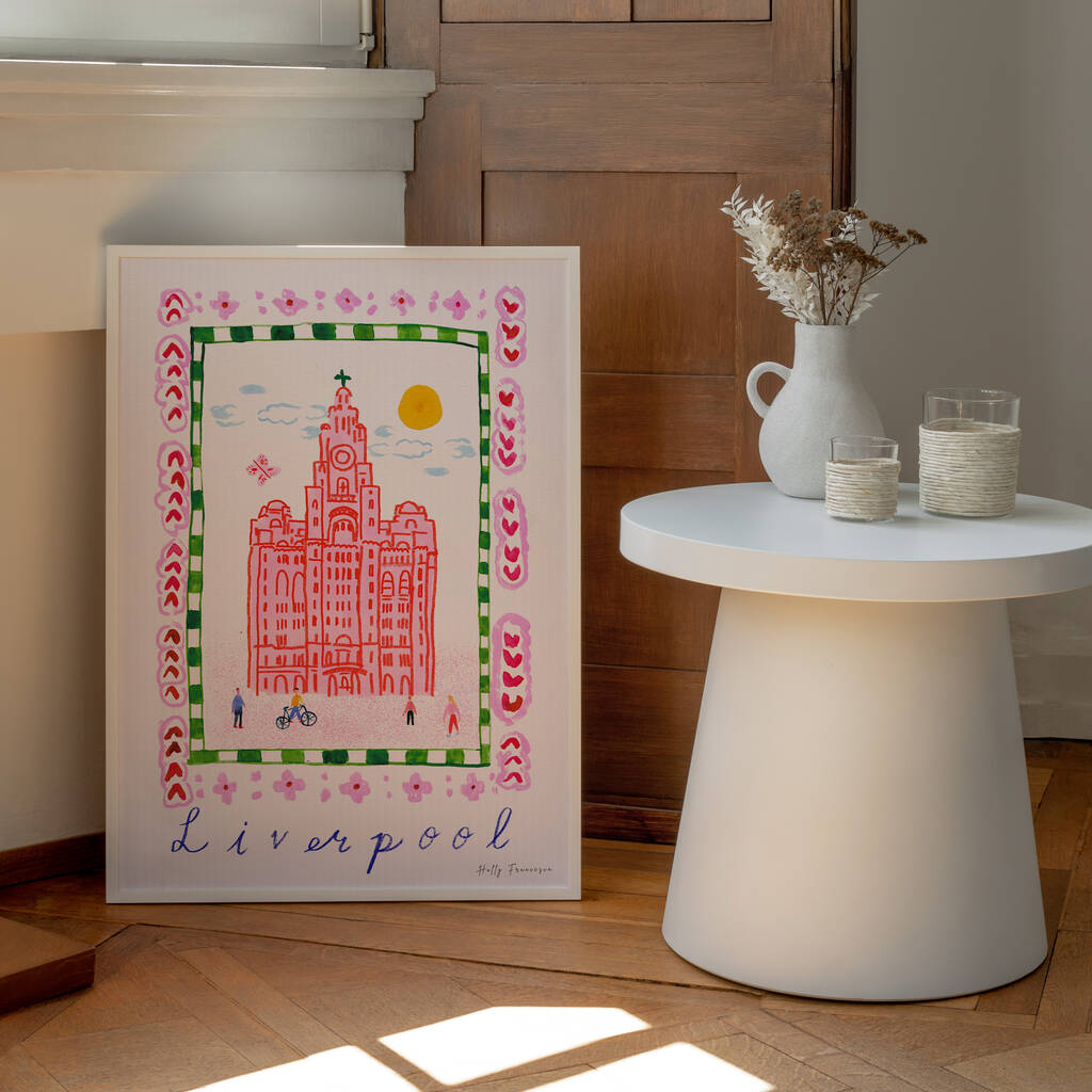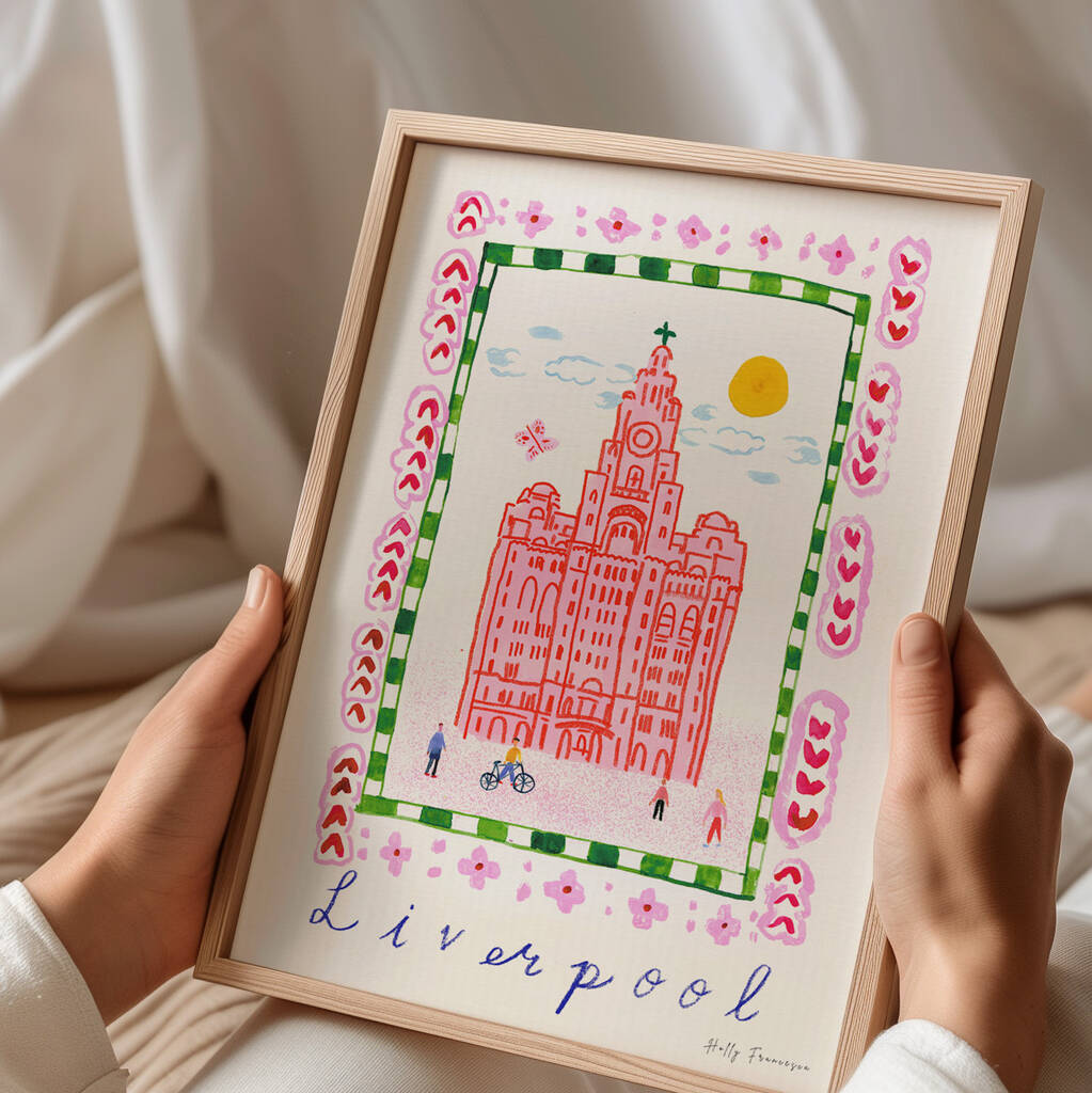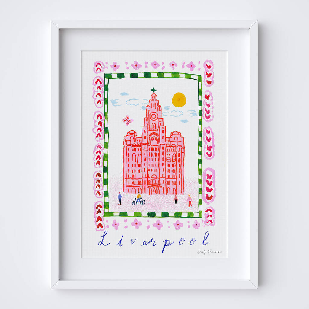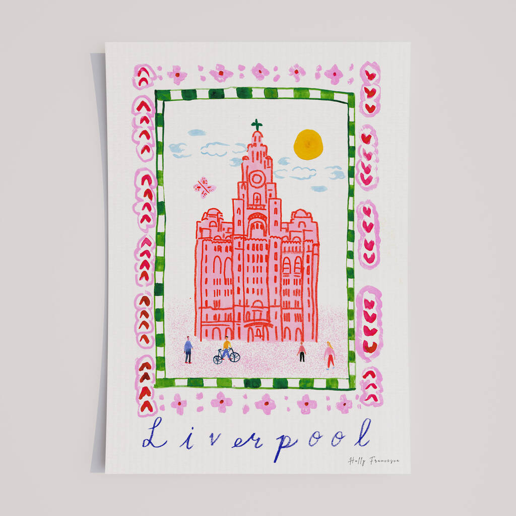 Inspired by the Royal Liver Building. An Grade I listed building in Liverpool, England. It is located at the Pier Head and along with the neighbouring Cunard Building and Port of Liverpool Building is one of Liverpool's Three Graces, which line the city's waterfront. This travel poster was created from mixed media (using watercolour paints, pastels & coloured pencils) by artist Holly Francesca.