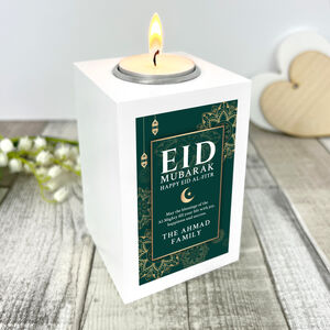 Personalised Eid Al Fitr Crescent And Lanterns White Tea Light Holder