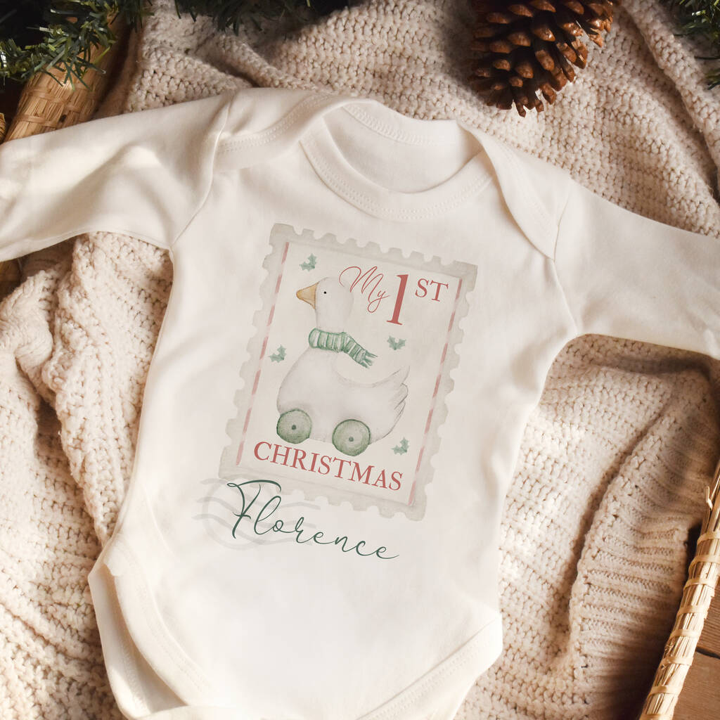 Celebrate a little one’s first festive season with this beautifully illustrated personalised baby sleepsuit, featuring our hand-painted goose toy within a vintage postage stamp.