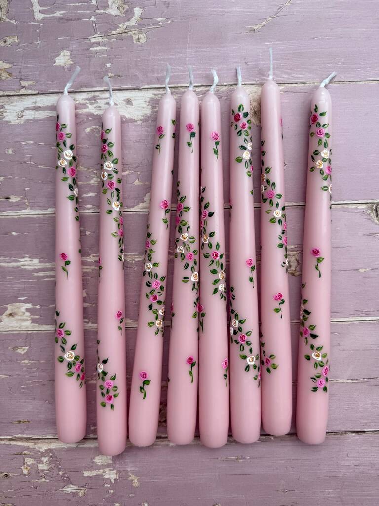 Delicately hand painted candles with pink roses and white roses in a soft trailing garland dotted with single buds.