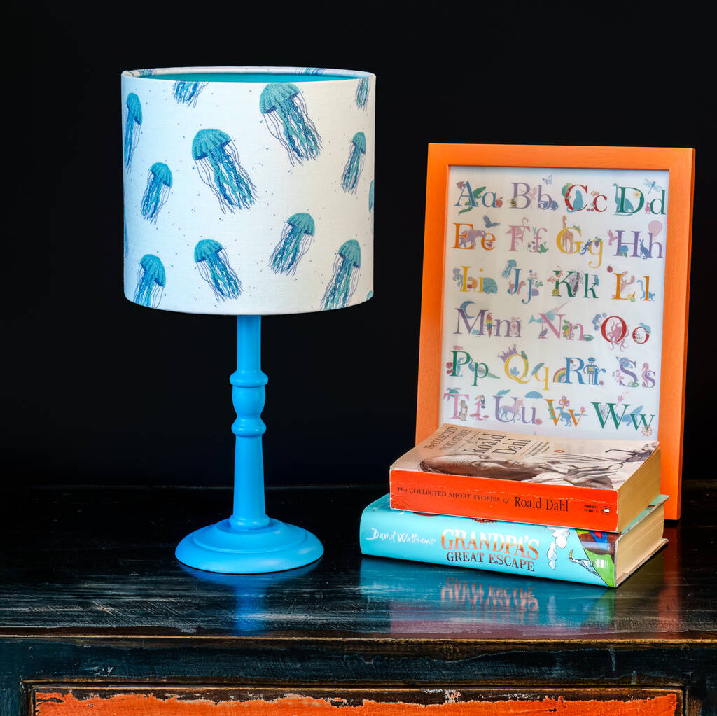 A lovely lampshade made just for your home. With this pattern you can choose betwen 2 fabrics (white or blue background), then you can choose from a wide range of lining colours to make it perfect for your room. You can also pair it with one of our colourful lamp bases too.