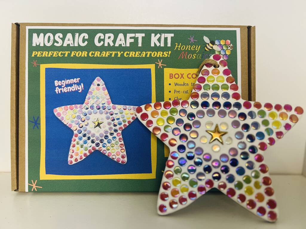 Your kit includes everything your child needs to create their very own large mosaic star. Each kit comes beautifully boxed with clear, easy-to-follow instructions, making it perfect for beginners. The finished decoration includes a hanging hole and string, and you also have the option to personalise it with a name or word – turning it into a truly special keepsake.
