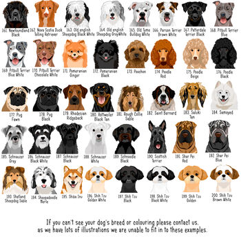 We carefully draw the illustrations by hand, and always adding new breeds and colourings. So if you can't find an illustration that matches your dog, please message us as we may be able to add it.