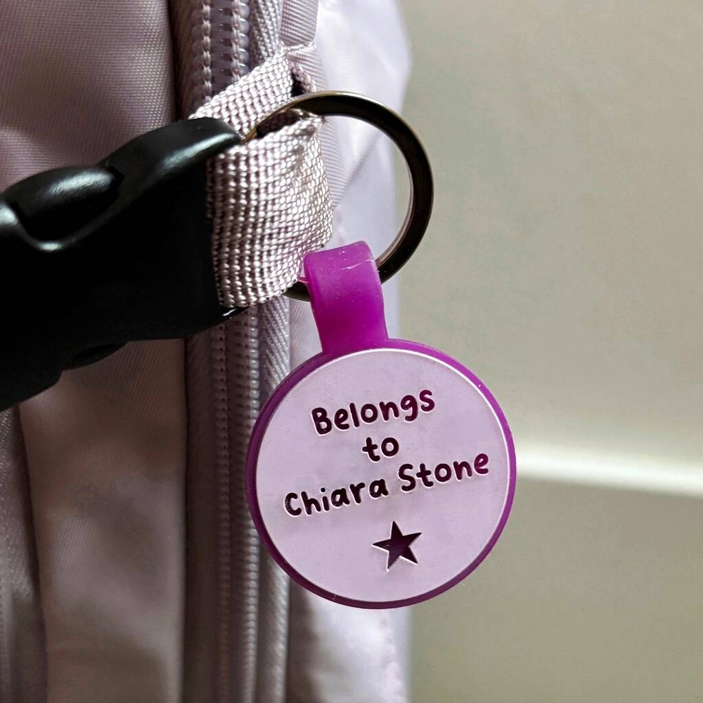 A cute colourful name tag for a school bag, or your luggage, personalise both sides with your own words
