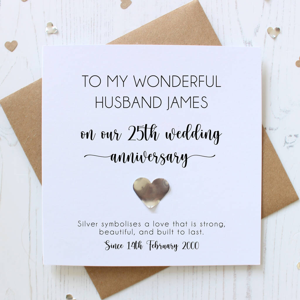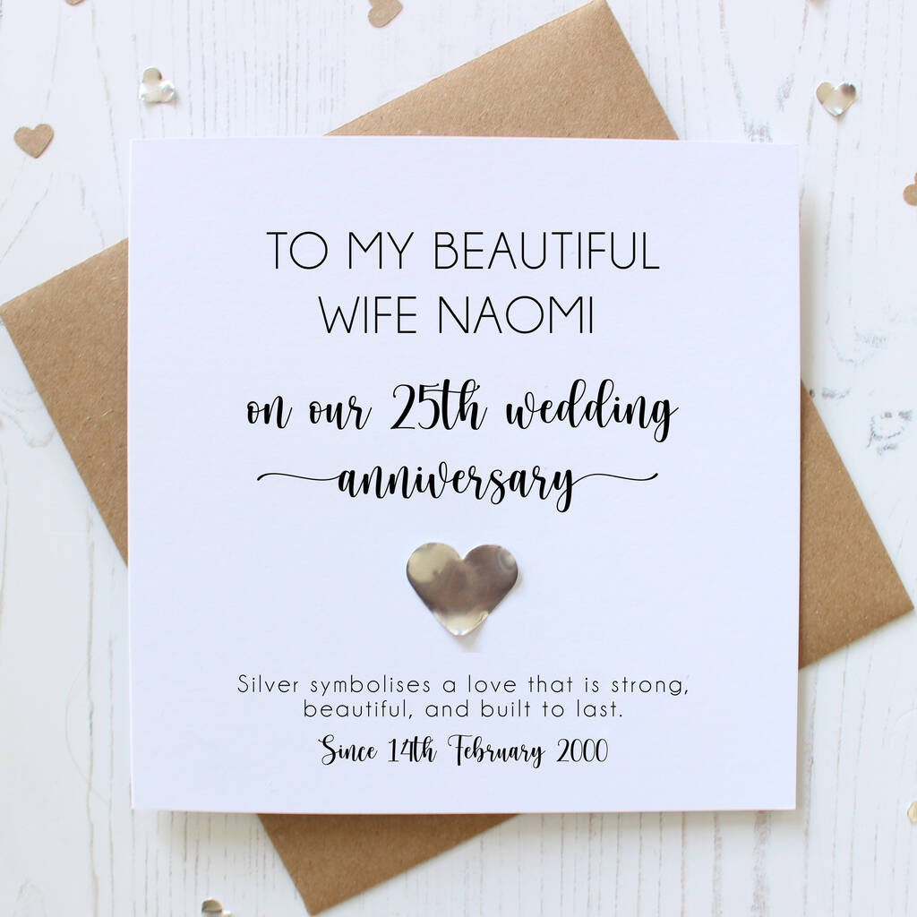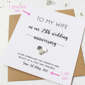 Celebrate a beautiful milestone with our personalised 25th wedding anniversary card, featuring a stunning silver heart.