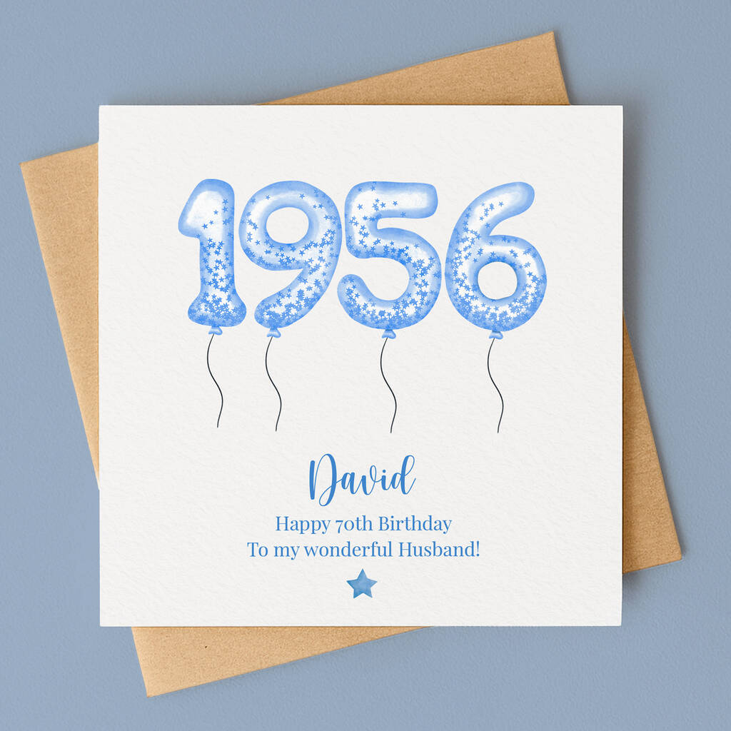 This delightful card showcases four blue balloons, proudly displaying the numbers 1956. The recipient's name is featured in a bold italic font, complemented by a personalised message of your choice underneath.